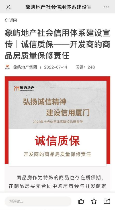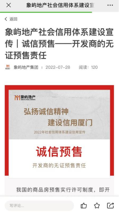 象嶼地產以報道誠信企業(yè)案例、倡導高品質產品和服務,弘揚全社會誠信典型的精神。同時,結合培育與踐行社會主義核心價值觀工作,象嶼集團不定期通過微社區(qū)發(fā)布誠信典型事跡,褒揚誠實守信的先進典型:象嶼創(chuàng)投組織員工進行《廈門市社會信用體系建設2022年工作要點》自行學習及廉潔從業(yè)書籍閱讀,提升員工對信用體系建設的理解;象嶼興泓公司組織先進分享業(yè)務及安全骨干心路分享活動,銷售副總對各業(yè)務部門業(yè)務開展情況進行點評,展現了象嶼集團引導廣大職工學習先進,發(fā)揮先進的示范引領帶動作用,為廈門這座全國文明典范城市創(chuàng)建助跑添力。