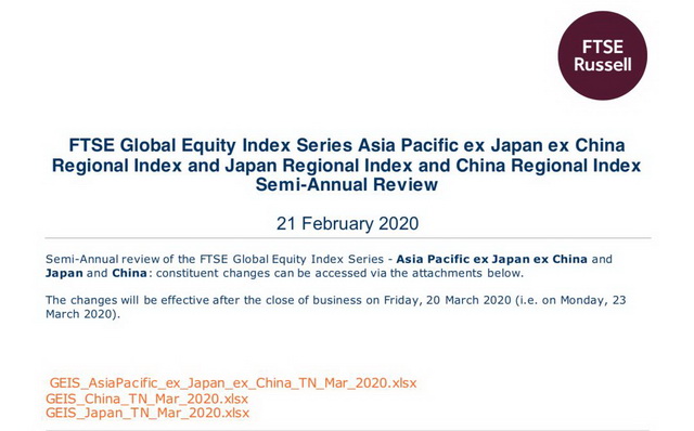北京時(shí)間2月21日,全球第二大指數(shù)公司富時(shí)羅素公布了其旗艦指數(shù)2020年2月的季度調(diào)整結(jié)果。廈門(mén)象嶼(600057.SH)首次入選其旗艦指數(shù)——富時(shí)全球股票指數(shù)系列(下簡(jiǎn)稱(chēng)富時(shí)GEIS),標(biāo)志著廈門(mén)象嶼進(jìn)一步受到國(guó)際投資者關(guān)注。此次入選將于2020年3月23日開(kāi)盤(pán)前正式生效。
