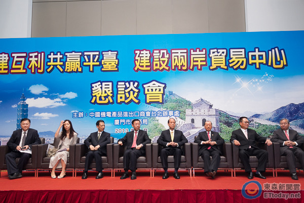 中國機電產(chǎn)品進出口商會臺北辦事處、廈門市商務局6日下午于臺北舉辦“搭建互利共贏平臺建設兩岸貿(mào)易中心”懇談會,機電商會臺北辦事處主任李榮民(左四)、廈門市商務局副局長鄭耀(左二)、福建省貿(mào)促會會長張秋(左三)、廈門象嶼集團董事長王龍雛(左一)等官方、企業(yè)界均親自與會,臺灣方面商總理事長張平沼(右三)、臺北市商業(yè)會理事長王令麟(右二)、臺北市進出口公會理事長黃呈琮(右一)等工商企業(yè)領袖應邀出席,?;鶗麻L林中森(右四)也特別到場。(圖/記者徐文彬攝)
