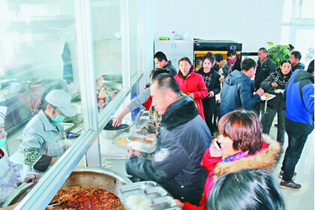 綿延幾公里的大貨車分四路匯集富錦象嶼金谷農(nóng)產(chǎn)有限公司外等候送糧,警車徘徊在各個路口維持秩序;飛機場地般寬闊平坦的院內(nèi)廣場上,稱重、檢驗、卸糧、烘干等一系列交糧工作有條不紊地進行,一座座大糧倉按編號排列等待蓄糧;檢驗檢測大廳里,工作人員各司其職,認真工作。透過玻璃墻,農(nóng)民在休息室里一目了然。一張告示“請水稻客戶當天結(jié)算,換取發(fā)票,否則無法打款”提醒往來農(nóng)民打款須知。晚17:00,免費餐廳廚房大鍋菜葷素搭配,品類齊全,白開水供應充足。