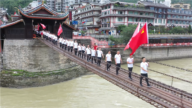 飛奪瀘定橋,是紅軍長征路上的關鍵一仗,是一場比智慧、比毅力、比勇氣的戰(zhàn)斗。“挑戰(zhàn)之旅”隊伍在黨旗和支線旗的引領下,行進在鐵索橫江的瀘定橋上,一幅幅戰(zhàn)斗畫面在腦海中浮現,一聲聲吶喊和槍炮聲猶在耳畔回蕩,激發(fā)起象嶼建設集團團隊干事創(chuàng)業(yè)、勇于挑戰(zhàn)的工作熱情。