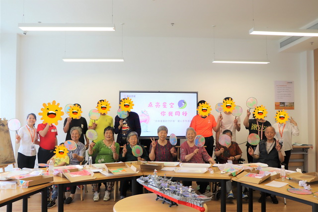 5月9日,在象嶼慈愛老年養(yǎng)護中心,長者們與“星寶”親密互動,共同完成精美的濕拓畫手工扇作品。