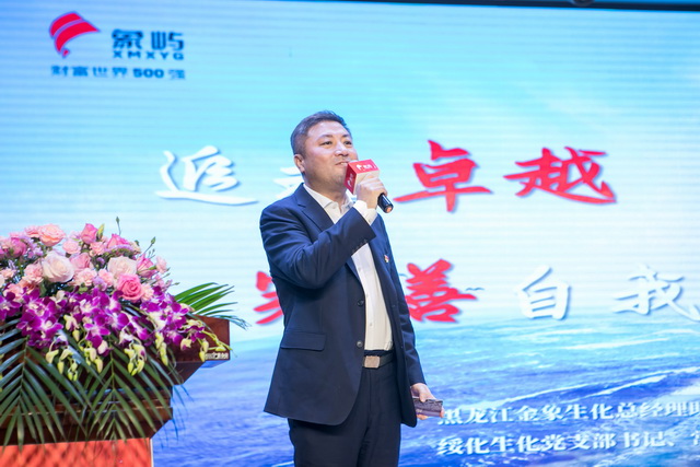 ▲黑龍江金象生化總經(jīng)理助理、綏化生化黨支部書記、常務(wù)副總經(jīng)理黃紹軍帶來(lái)宣講《追求卓越,完善自我》