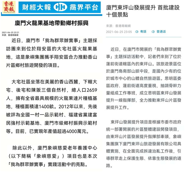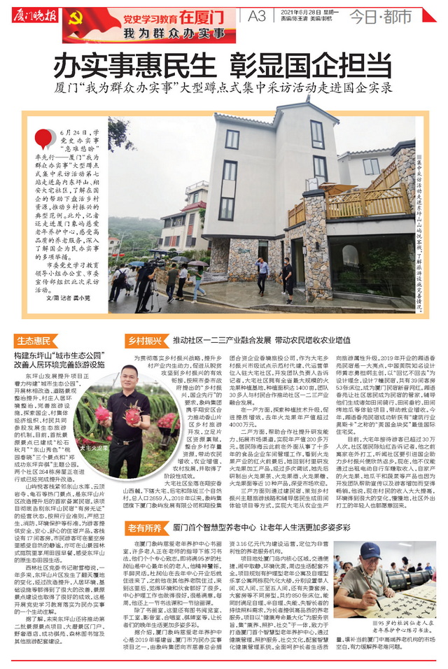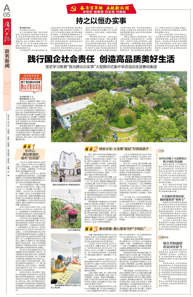 象嶼集團(tuán)正以“我為群眾辦實事”實踐活動為抓手,深入學(xué)習(xí)貫徹習(xí)近平總書記重要講話精神,著力解決人民群眾急難愁盼問題,為百姓創(chuàng)造美好生活。近日,由廈門市委黨史學(xué)習(xí)教育領(lǐng)導(dǎo)小組辦公室、廈門市委宣傳部組織的黨史學(xué)習(xí)教育“我為群眾辦實事”大型蹲點(diǎn)式集中采訪走進(jìn)象嶼集團(tuán)。境內(nèi)外近20家媒體深入東坪山發(fā)展提升項目、大宅鄉(xiāng)村振興項目和象嶼慈愛老年養(yǎng)護(hù)中心,對象嶼集團(tuán)辦實事、解民憂、惠民生的創(chuàng)新舉措進(jìn)行集中報道。