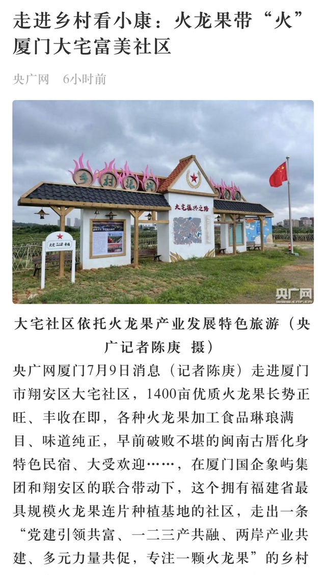 翔安大宅社區(qū)坐落于香山西麓,火龍果種植面積達(dá)1400畝,先后被評為全國“一村一品”示范村、福建省黨建富民強(qiáng)村示范基地、廈門市級鄉(xiāng)村振興示范村等。不過,種植火龍果的基地不少,為什么就“火”了翔安大宅?