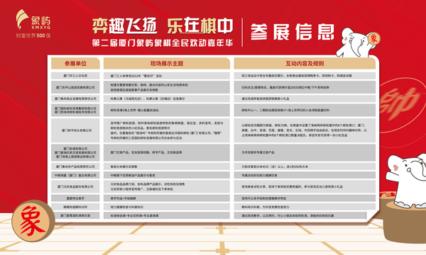 嘉年華現場還設置了象棋主題文化展區(qū),包括當代象棋大師臉譜及象棋文化展、廈門象嶼象棋隊精彩回顧及象嶼品牌、公益主題展等,通過豐富的圖文資料,帶您回顧廈門象嶼象棋隊的精彩瞬間,展示出征象甲“新班底”。