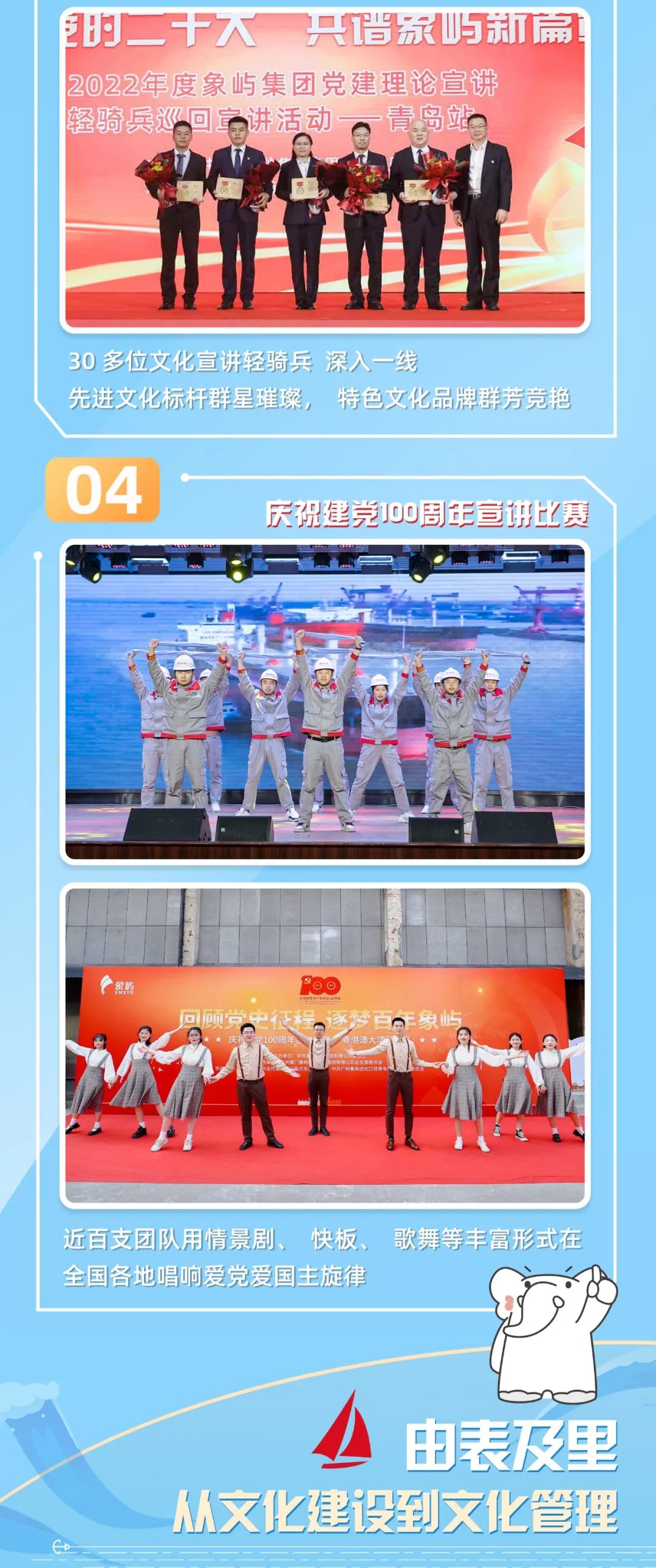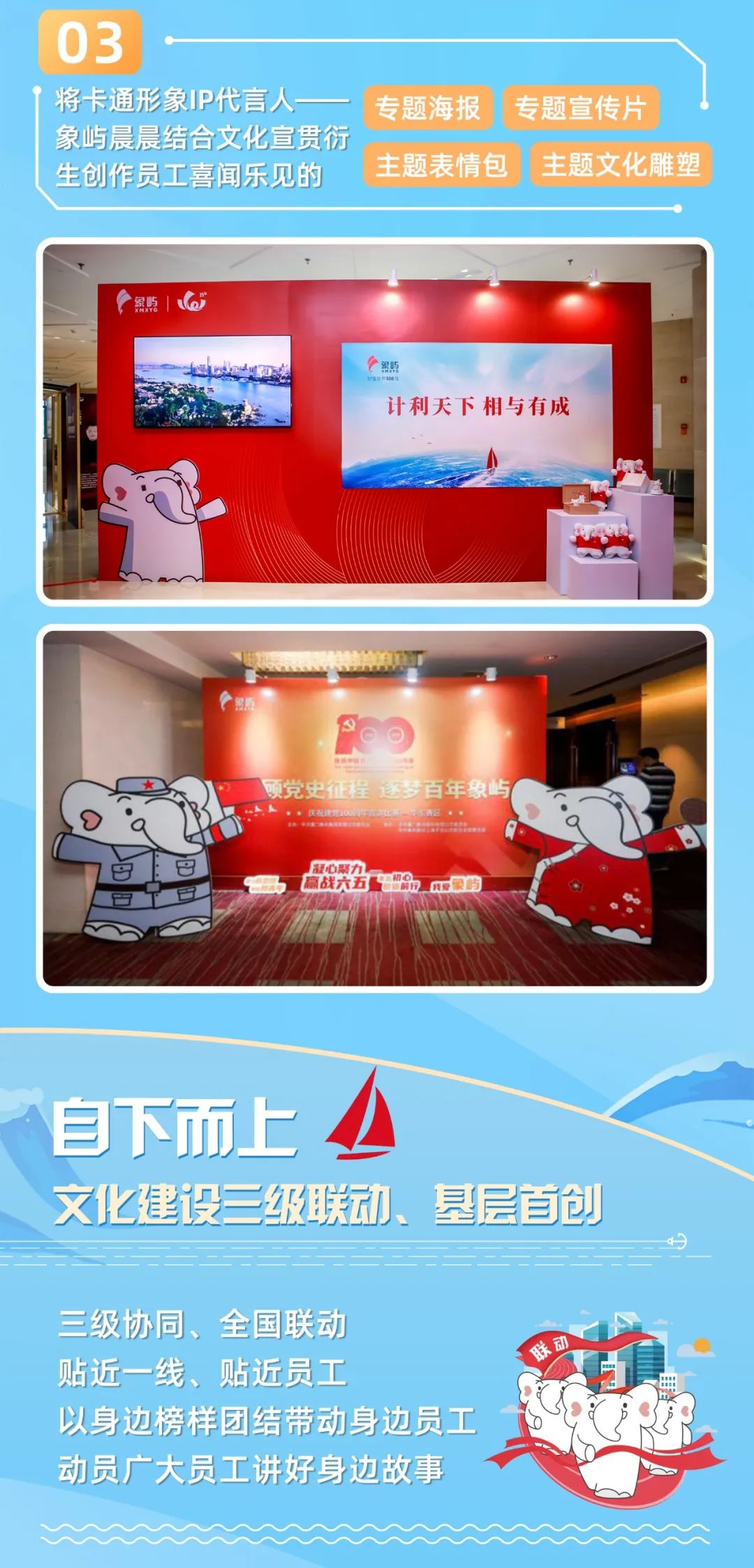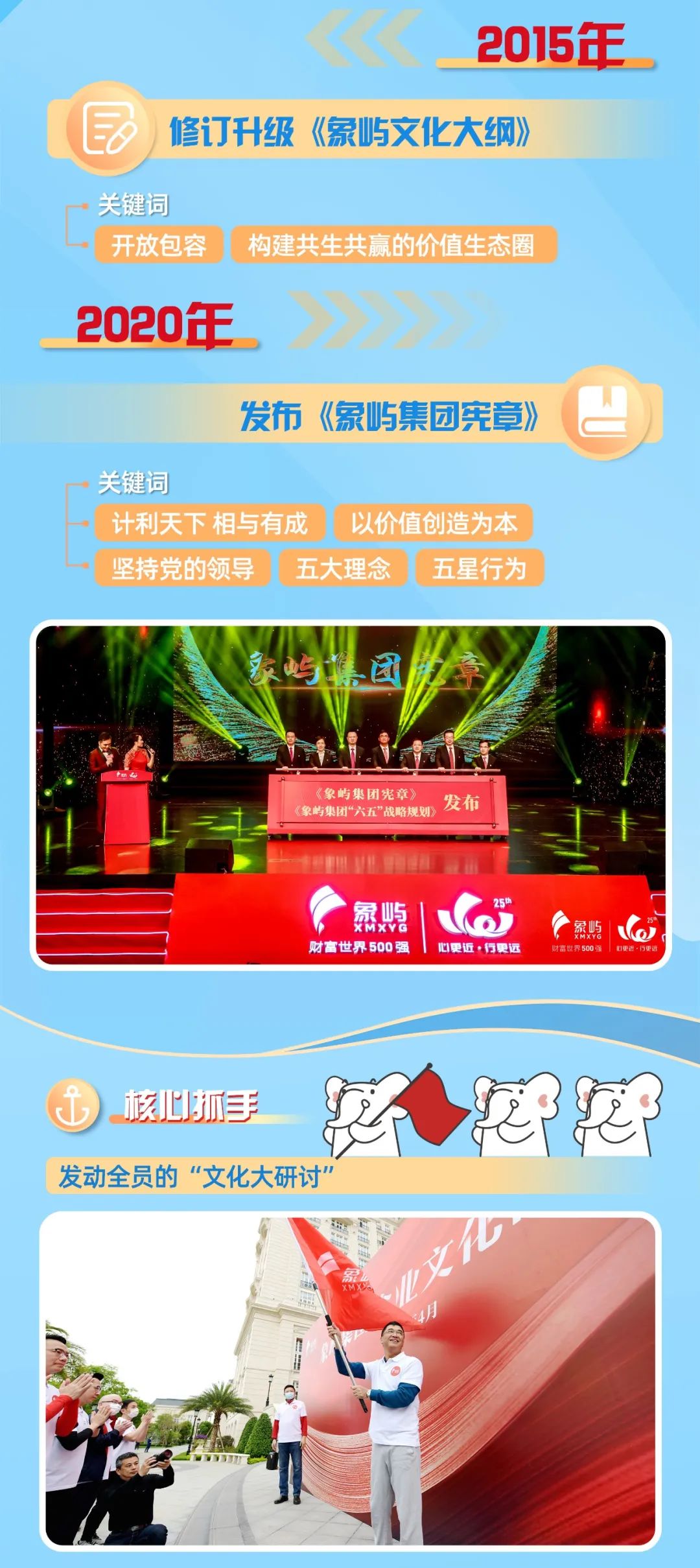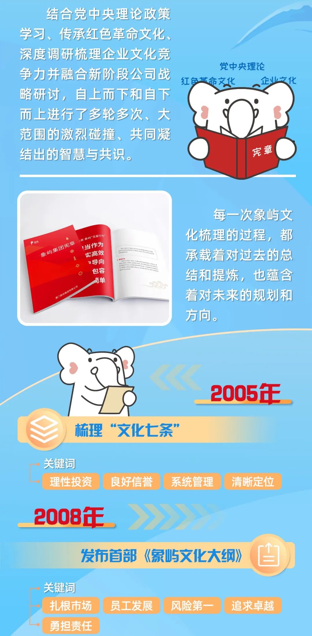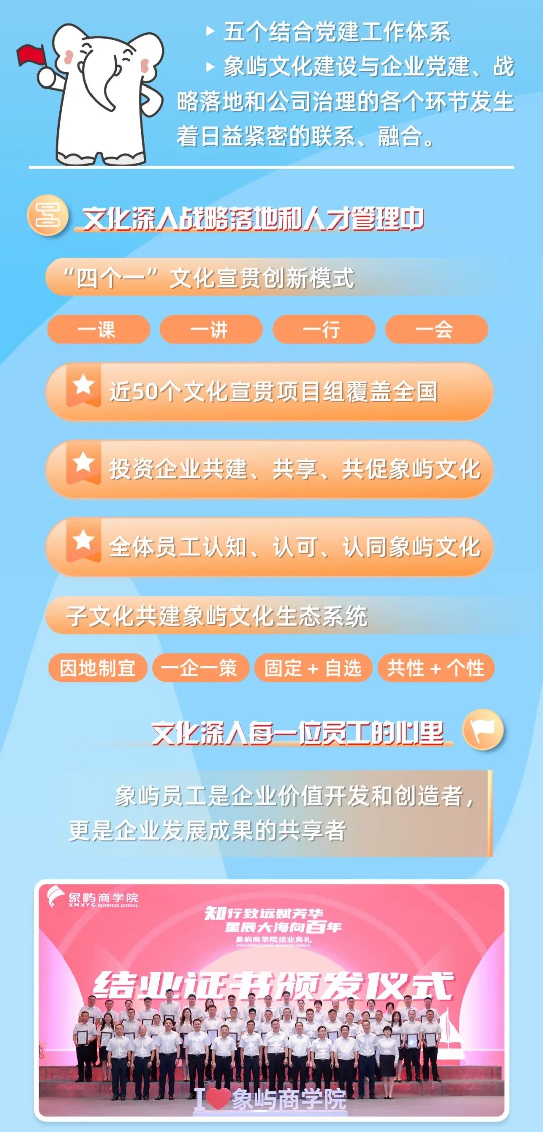 習(xí)近平總書記指出:“我們要堅持道路自信、理論自信、制度自信,最根本的還有一個文化自信”“文化自信,是更基礎(chǔ)、更廣泛、更深厚的自信”。27年來,象嶼集團始終堅持黨的領(lǐng)導(dǎo),以創(chuàng)新開拓的特區(qū)精神投身于改革開放和市場經(jīng)濟的發(fā)展浪潮中,歷練出以堅持市場化道路、堅持風(fēng)險第一等為核心的、蘊含海洋基因的特色企業(yè)文化,為企業(yè)高質(zhì)量發(fā)展筑牢根基,提供強有力的精神動能。